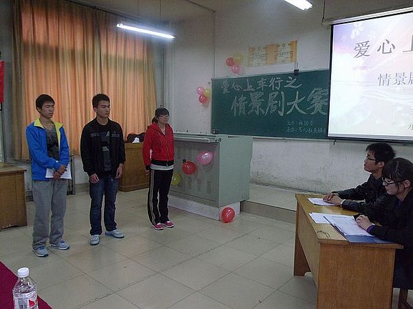 以情景演绎生活,用行动诠释美德。11月3日下午,由校团委主办、公司先锋社、艺心社承办的爱心上车行系列活动的最后一项活动情景剧大赛在13号教学楼401教室举行。公司社团联合会各社团负责人出席此次大赛并担任评委。