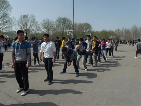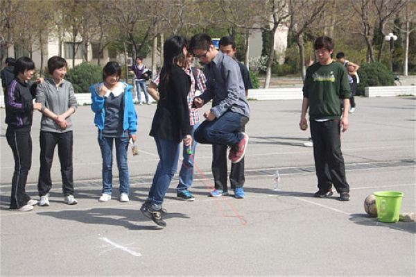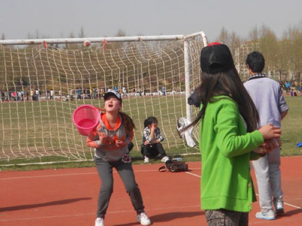 趣味运动会向来以竞技与娱乐结合而著称,以充分调动同学们的运动热情、吸引大家积极参与其中为宗旨,所以,队员之间那种默契的配合往往成为比赛的有力看点。而背投沙袋则是这样一个考验选手之间默契程度的趣味赛事。比赛中,各参赛选手积极发挥着自己的才能,投沙袋者努力的控制着沙袋抛出的方向,接沙袋的选手则尽其所能的用其背上的筐去接飞过来的沙袋,“蹲踞式”“奔跑式”“跳跃式”各种看似莫名其妙的接袋姿势,却往往能起到意想不到的效果。赛场上,掌声、笑声、喝彩声此起彼伏。每当接到一个沙袋时,选手们都会举起双手做出胜利的姿势。接袋的动作虽然很耗费体力,然而女参赛选手们毫不逊色于男选手们,她们以彼此间默契的配合、柔韧的身体、灵敏的判断,总能更加准确的接住沙袋。所以,出人意料的,女生在此项赛事中占据了一定的身体优势。