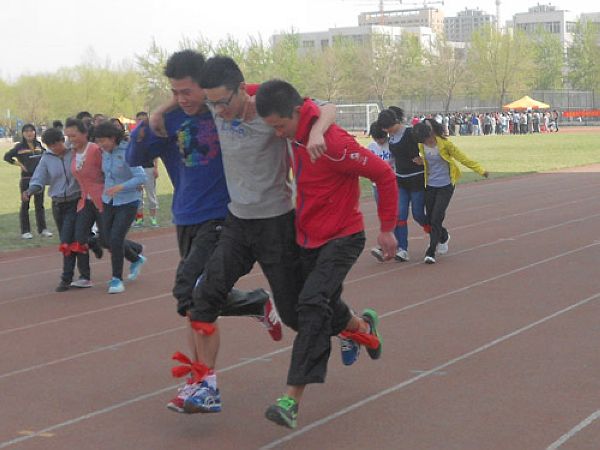 三人四足是项传统的趣味运动,即三名队员之间用布带将腿绑在一起,保证绳子不会突然断开,以跑完50米的时间长短排名。比赛中,不同的比赛选手采取不同的比赛策略,因此彼此对该项目的熟练程度也不尽相同。有的组合迈着整齐的步伐,齐头并进;有的组合稳打稳扎一步一个脚印,从容不迫的冲向终点;还有的组合高声喊着口号,节奏一致的前进。整个比赛俨然成了一场拉距战,以一种别样的方式展示着运动的魅力。