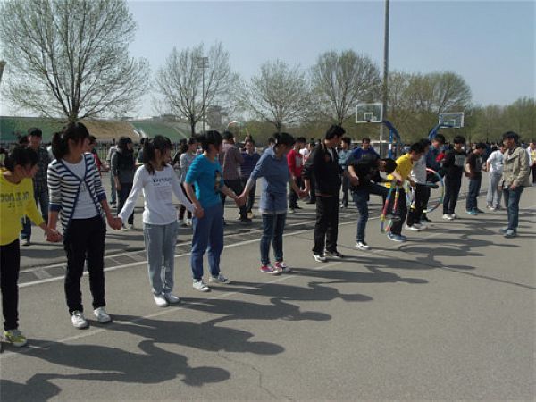 此项目由一队小组成员进行,要求小组人数超过10人以上,男女人数不限。具体规则为小组内队员手拉手站成一排,一共放两个呼啦圈,从工作人员放至第一个呼啦圈开始计时,比赛过程中呼啦圈不可以落地,队员不可以断开队形,否则判犯规,给予响应的加时惩罚。当两个呼啦圈均通过队伍时计时结束,用时最短的队伍取胜。此活动对团队的配合协同力要求比较高,其中速度和柔韧度是获胜的关键所在。