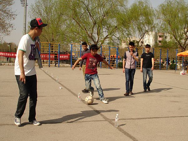 “三项全能”比赛涉及定点投篮、障碍跑、带球过“桩”(矿泉水瓶)和定点射门四个子活动,是一项综合性较强的趣味运功。为保证赛事公平性,比赛分为男子组和女子组,并由抽签决定出场顺序。活动中,每位选手都为能发挥出自己的最好水平而竭尽全力。定点投篮环节,各个选手便试图与对手拉开差距,不少选手曲腿、压腕、指尖拨球,动作标准、一投命中,展示了不俗的实力。之后的障碍跑环节,选手则更是争分夺秒,轻巧的逾越障碍,冲向“球桩”,带球绕过七个“桩”,一脚猛射,将球打进了球门,完成此项比赛。