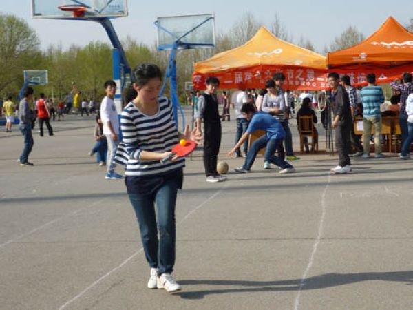 创新性的托球跑比赛是一场智力与体力的展示,首先由女生从起跑线用球拍托着乒乓球跑到终点,绕过障碍再跑回起点,然后另一名男同学用棍子推着篮球前进,同样到达终点后绕过障碍回到起点,用时最少的队伍获胜。由于风的原因,乒乓球并不是很安稳得呆在球拍上,而是左右滚动,好像和比赛人员故意“作对”,但参赛员工还是一本正经、为团队荣誉捡起被吹跑的乒乓球继续比赛。棍推篮球则更是对男生协调能力的考验,直线与球体的结合画出完美的“曲线”,场上裁判也严格按照公平公正的原则紧随运动员,场下观众情绪高昂,为他们加油呐喊。