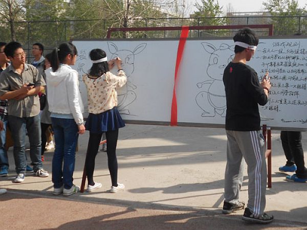 袋鼠画眼睛是趣味运动会的项目之一,比赛分队进行,两队同时参加,每队由六人组成,分为两小组,每小组的三人中有一人负责袋鼠跳,从起点开始手拿一支笔跳50米,将笔传给自己的一名队友,拿到笔的同学要蒙上眼睛,原地转三圈,在剩下的一位队友的指引下,走到题板前,在指定位置画下一只眼睛。这一组进行完之后,示意另一组同学开始,重复第一组,将另一只眼睛画好,比赛完成,记录各队的所用时间。比赛结束后,一位参赛者说道:“袋鼠画眼睛活动很新颖,很有趣,最重要的是这个活动要六个人组队参加,提高了大家的团队合作意识,同时增进了同学们之间的交流和配合。”