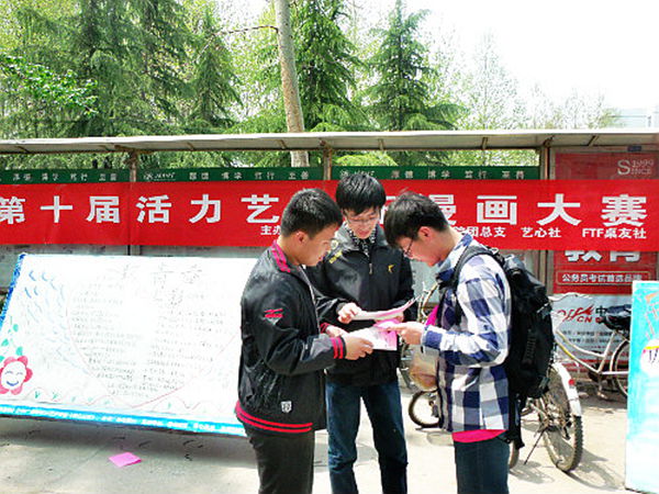 为丰富校园文化生活,4月24日中午,由校团委主办,公司团总支、院艺心社、FTF桌友社承办的第十届“活力艺心杯”漫画大赛前期宣传活动在第二、三餐厅门口同时进行。
