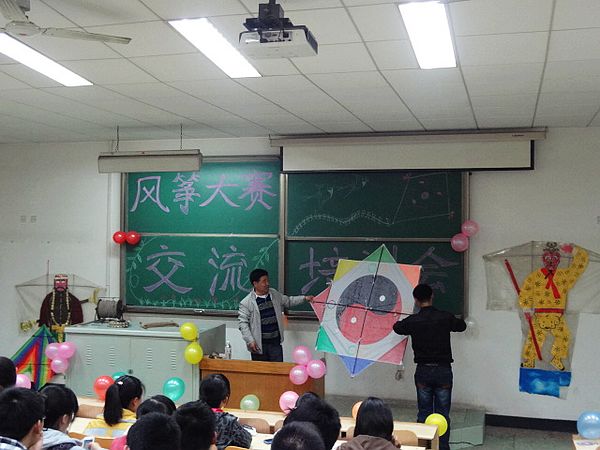 此次交流培训会特邀淄博市风筝协会主任耿炳华对同学们进行培训。耿炳华首先对风筝的种类,怎样做出好的风筝做出了详细的说明,随后他对放风筝时如何让风筝“飞得高,飞得远”等注意事项进行了具体的讲述。培训会上,耿炳华以诙谐幽默的方式向大家展示了自己制作的风筝,并对风筝的结构进行了简要的讲述。他提到,风筝的种类很多,不仅扎制的构架不一,其图画也各种各样。要做出好的风筝,选材很重要,在扎制过程中要耐心仔细,不能急于求成。他一边给大家讲解一边拿起身边的风筝指给大家看。在给同学们讲完风筝的基本知识后,同学们对自己不懂得地方提出了疑问,耿炳华耐心的为同学们解答,赢得同学们阵阵掌声。同时,耿炳华表示,如果大家感兴趣或有什么不懂的问题,可以随时和他联系。他会尽快给大家解答疑惑。据悉,风筝大赛将于5月4日举办。