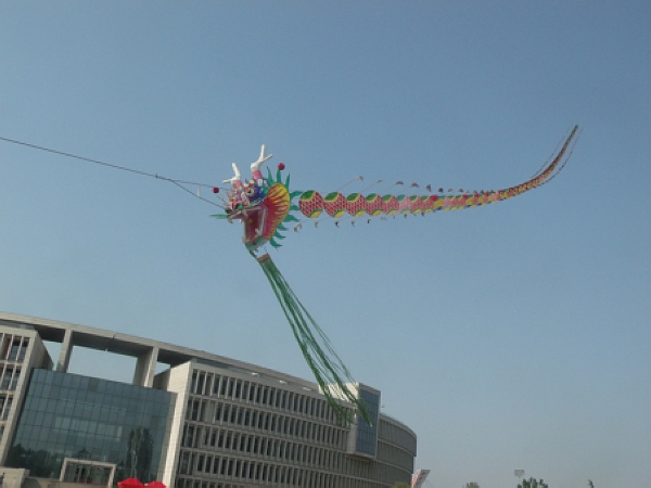此次比赛最大的看点除了“龙”风筝,要数同学们别出心裁的原创作品。简短的启动仪式后,比赛正式开始。此次比赛分为六个小组,每个小组又包括几个小队,按顺序每个小队将自己的风筝放飞到空中停留10分钟左右,不可跌落。一时间,各式各样的风筝让人眼花缭乱,腾云驾雾的孙悟空风筝在空中高高飞翔,仿佛在寻找妖怪;太上老君的“八卦图”风筝遥遥领先,引无数小鸟试比高;小巧精致的蝴蝶也不甘示弱,紧随其后。同学们制作的心形风筝,也一起放飞在空中。当然最精彩的要数“龙”风筝,百米长的“大龙”在同学们的帮助下活跃在蓝天之中,纤长的龙身来回摆动,时而上移,时而回旋,现场同学拍手称赞。在此期间,评委根据风筝的飞的平稳程度和高度打分,并将于近期在公司网站公布最后成绩。