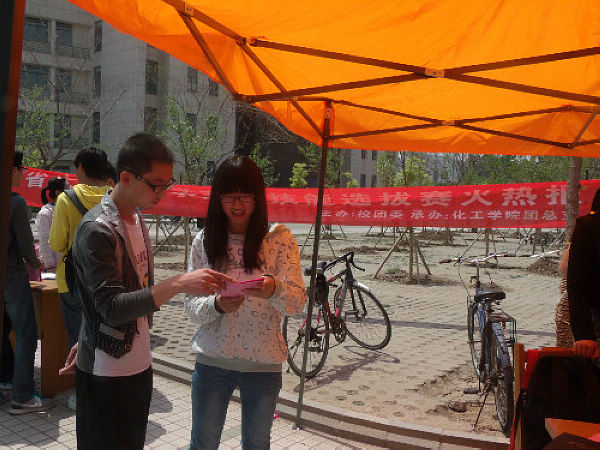5月7日中午,由公司校团委主办,公司团总支、浩宇化学社承办的“山东省老员工化学实验技 能选拔赛”的宣传活动在第三餐厅门口进行。
