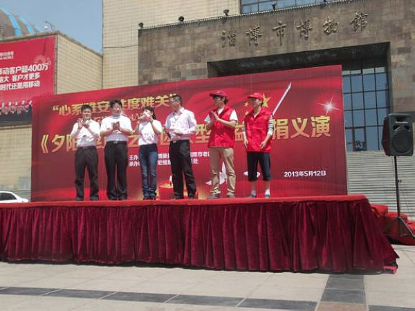 5月12日上午,由淄博新闻广播电台、淄博市老龄办主办,齐鲁电视台、“夕阳正红”艺术团、淄博红十字会、山东理工大学“爱心义工第十大队”、艺心社、爱智慧心理协会联合举办的“心系雅安 共度难关”公益募捐活动在淄博市博物馆广场开展,活动主要为灾区重建进行义演义卖。