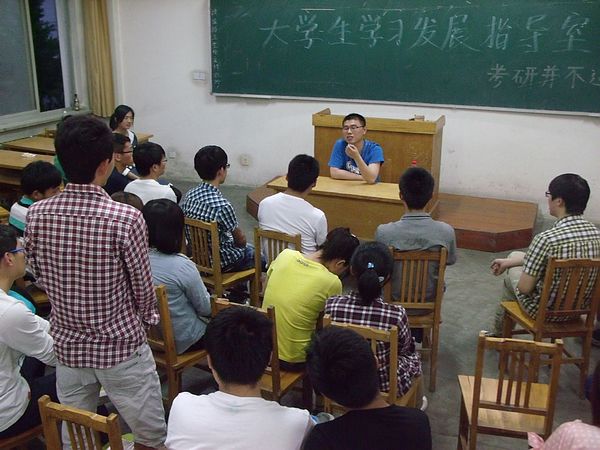 刘凯到场首简短的介绍自己后开门见山,直接切入考研主题。他告诫同学们在稳抓专业课的同时,还要积极学习英语,这对考研成绩的影响是非常明显的。同时他表示要定下目标,坚定志向并为之不懈奋斗,以充分的准备迎战考试。接着刘凯就考研复习策略、填报志愿要领及如何联系导师等考研信息进行详细讲解。经过其一番介绍,同学们考研热情更加高涨,积极提问,现场交流氛围浓厚。在作答时他说:“我备考英语四级的时候单词背了一整本,听力主要专攻真题训练,也会读课文进行语感的培养。有时候也会感到枯燥,但一直是咬牙坚持下来的。英语对于我们今后的生活很重要,考研、学术交流、论文都离不开英语,学好英语才能把自己向外推广出去。”活动最后,同学们纷纷与其交换了联系方式,表示今后有不懂得地方还会请教,刘凯也表示热情欢迎大家的提问,希望自己能够帮助大家。