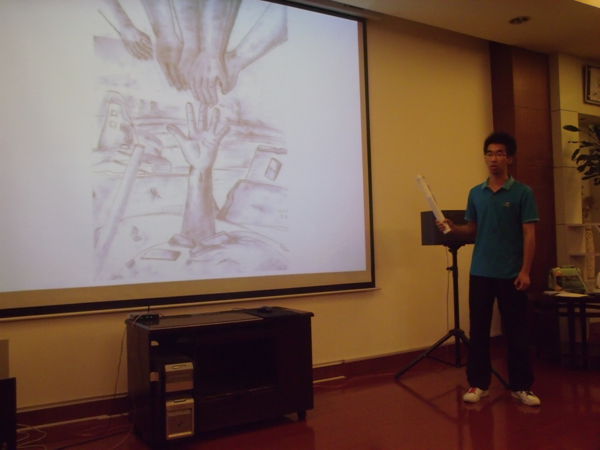 大赛伊始,由主持人介绍到场嘉宾、评委,并宣读比赛规则及评分细则。随后,伴随着柔和淡雅的轻音乐,决赛选手一一上台展示自己的作品,每位选手有2分钟的时间进行展示,通过简单扼要的语言向评委们阐述作品的立意、内涵。评委根据作品的画工、立意及色彩搭配为选手打分。决赛作品可谓风格各异,难分伯仲。选手个个表现不凡,作品有的以关爱孤儿、亲情友情为主题,有的则反映社会腐败现象,以反腐倡廉为立意;还有的则从自身出发,将老员工活真实深刻的反映出来。在众多作品当中,为数不少的选手不约而同的把主题定为了雅安地震,他们切合雅安地震的社会背景,以自己的理解创作出风格迥异的作品,表现自己的一种社会责任感。其中,一幅以黑灰白为主色调的作品映入大家眼帘,作品中描绘了在废墟下伸出的一双手,废墟上面有多双手去拉,以雅安废墟为背景,视觉冲击感强,令在场评委和观众震撼。