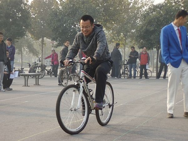 自行车慢骑,虽然比速度,却以速度最慢者获胜。整个比赛当中脚不能碰地,不能驶离赛道,否则判犯规。这不仅考验选手们的平衡能力,还要考验他们的心态。郭洪涛老师分在第一组第三赛道,裁判员一声令下,选手们踩上脚踏板,努力控制自己的速度,保持身体与自行车的平衡。比赛当中,郭洪涛老师不断调整,全身心投入到比赛中,虽然会有失误,但经过调整之后马上进入状态。最终,他凭借过硬的技术与较强的心理素质在小组赛中夺得头魁,决赛中获第五名的好成绩,赢得在场观众阵阵掌声。