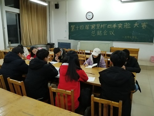 为保证浩宇化学社以后的活动举办的更加精彩,12月5日,浩宇化学社在13号教学楼405教室举办第十四届居里杯实验动手大赛总结会议。会议有副会长刘超越、刘晓、赵爱丽、朱志晓以及全体干事参加。 会议伊始,刘晓指出活动准备期间出现的一系列问题,她说:“首先,报名方式只采取了到梦空间报名导致参赛人数受限,很多想参加活动的同学没有报名成功;其次,初赛题目虽然后来在各位副会长的努力下得到了完善,但刚开始不够严谨;最后,宣传力度不够大,宣传类型比较少导致参赛公司类型少。”刘晓又指出决赛准备的也不够充分,决赛提前占好的教室被老师调课所占,临时改变决赛地点,给参赛人员带来了一系列麻烦。她指出以后为了确保报名活动人数的准确性,之后活动将采取私聊管理员报名,统计最终报名信息的方式。对于竞赛类试题确保题目的严谨与准确。对于教室要有预备方案做到未雨绸缪,避免此次事情的发生。活动宣传方式要多种多样,可增加餐厅宣传方式。 此次总结会议,详细的归纳了活动准备期间浩宇化学社成员的不足和疏漏之处,使浩宇化学社成员们都能够清楚的认识到自己的错误以更好的完善自己,提高自己的工作能力,有利于浩宇化学社以后举办活动的流程更加完整规范以能够更好的为同学们服务。