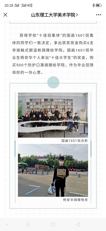 不仅仅是在疫情中,在普通生活中的杨安华也是个责任感很强的班长。大学四年来,国画1601共获集体荣誉13项,全班同学累计获得校级以上奖励400余项,连续三年被评为校级优秀团支部,并评选为“十佳班集体”、“”山东省优秀班集体。从来自五湖四海陌生的他乡人,变成如今紧紧团结在一起的大家庭,离不开杨安华地带动与凝聚。