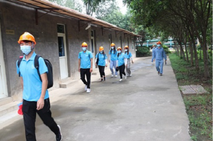 短暂休息过后,实践团成员在技术人员的带领下前往生产基地进行参观。在参观的过程中实践团成员发现各个原料室之后都隔着一段距离,技术人员介绍道,由于大部分化学药品都具有一定的挥发性,为防止连锁反应,确保安全,原料室之间都会有些距离。在生产过程中,由于全减压渣油催化剂工艺及催化剂技术的使用,一定程度上达到了节能减排的目的,但是催化剂有一定的寿命,过期后无法进行回收,因此,公司也在催化剂方面加大研发力度,希望能够研发出可以循环使用的催化剂,减少浪费。