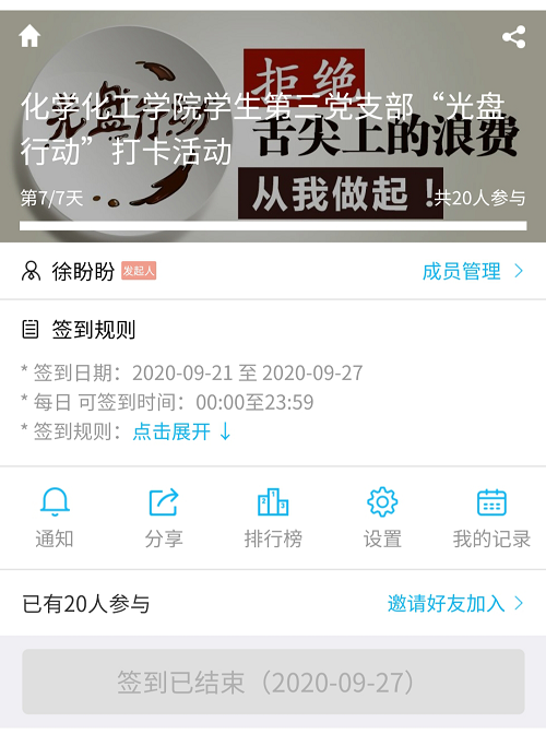此次打卡活动,旨在让员工党员养成好习惯,并在同学中起先锋模范作用,用自己的行动影响身边的人。我们提倡:买饭时吃多少买多少,不剩饭不剩菜。吃光碗里的最后一粒米,盘中的最后一棵菜,以“光盘”为荣,以“剩饭”为耻。员工党员既要做“光盘行动”的实践者,也要做“光盘行动”的推广者。