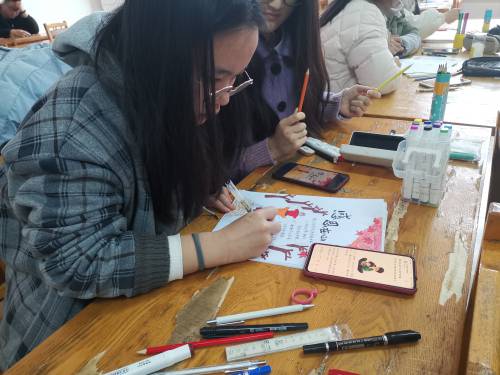 玉兰社工作人员提前来到活动教室布置会场,社内人员各司其职,分工明确。参与活动的员工陆续入场,工作人员有序进行活动签到工作。活动正式开始,玉兰社副会长上台为大家讲解感恩节相关知识,介绍活动各个环节以及规则,对规则不熟悉的员工就相关问题进行讲解。第一环节是自由发挥环节,同学们可以根据自己的想象任意作画并配上相应的文字,小组内两人分工合作,一人负责文案写作,一人负责绘画插图。