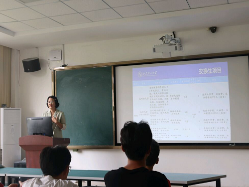 牟善芹向同学们提出四点建议:一是对自己的未来进行合理规划,及早确立目标;二是同时也要重视课程学习,做好学业规划;三是努力学习英语,做好出国语言准备;四是积极磨炼自己,做好心理准备。她向同学们介绍了出国交流选拔和派出程序的具体运作过程。