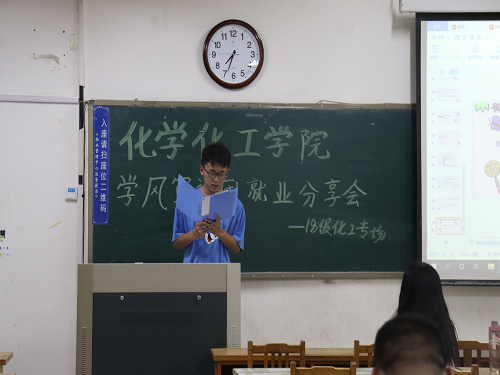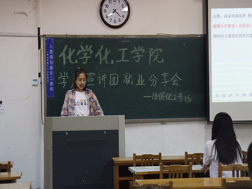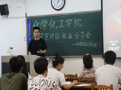 主持人介绍宣讲人。柳鑫雨报考南京大学,后调剂到浙江工业大学。赵保忠考取本校全日制研究生,但因找到合适的工作,将全日制研究生调整为在职研究生,并签约中国石油化工有限股份公司。