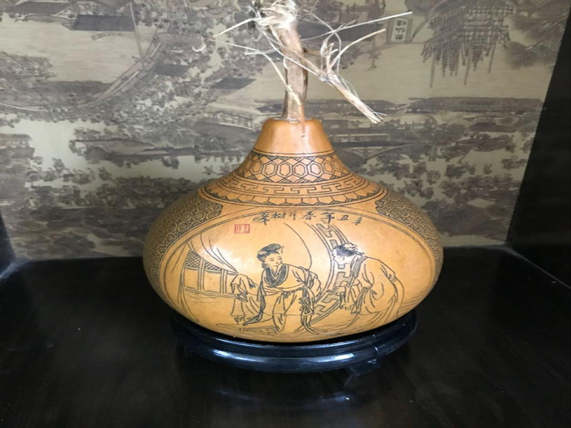 调研伊始,王树峰首先给实践团队展示了片花葫芦的雕刻,在雕刻葫芦的空隙,王树峰又给实践团队解释说,虽然现在葫芦已经开始了机器雕刻,但雕刻的葫芦大多品种单一,手法简单,受众有限,一个葫芦也仅能赚取五到六块的差价。而与之相比传统手工雕刻的价格可以增长近十倍,但目前手工雕刻耗时长,价格又受到雕刻者名气的影响,即使是同一种雕刻品,匠人名气的高低也会使得葫芦的价格相差5到6倍。