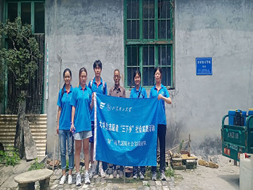 最后,老爷爷积极配合团队填写了调查问卷,成员们帮助老爷爷打扫庭院卫生并合影留念。