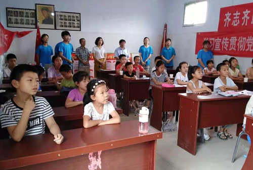 7月23日,齐志齐愿实践团青苗实践队如往常一样对“青苗班”孩子们进行趣味课程教学。马克思主义公司党总支书记郭奎霞、副经理房晓军、办公室主任李传高、教师李先伦、谭霞五位领导老师前来对淄博市周村区邓家村村民委员会“青苗班”的教学现场指导实践工作。