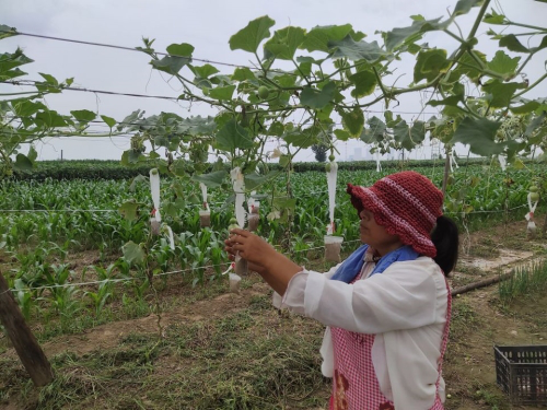 调研伊始,实践团队成员走访了几位正在葫芦地中辛勤劳动的种植户,参观了他们的葫芦田地,并进行了相关的采访调查。走进郁郁葱葱的葫芦地,看到长势形态各异的葫芦,实践团队成员内心充满了震撼与欣喜。葫芦福禄,幸福永寿,小小的葫芦寄托着种植户对美好生活的向往与期待。一位热心的当地葫芦种植户表示,现在一亩地的葫芦大概收入2万元,靠着种葫芦,她们家盖了楼房买了小汽车,走上了幸福小康路。