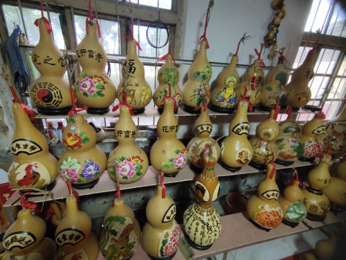 调研伊始,晨曦社会实践团队在聊城农商银行堂邑支行杨广涛经理的带领下,参观了当地葫芦加工基地。古香古色的陈列架上摆满了精美的东昌葫芦雕刻产品。据郝洪燃介绍,他所经营的葫芦加工厂是2001年成立,所加工的葫芦由最初的实用性向观赏性较强的旅游工艺葫芦逐步转化,制作工艺由原来单一的针雕和片花两种工艺向烙画、浮雕、彩绘、掐丝等多种创新性制作工艺渐渐演变。近些年来葫芦加工中实用性有所增强,酒壶、茶杯等产品在市面上也很受欢迎。
