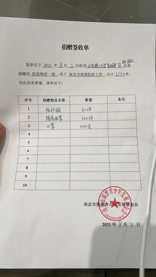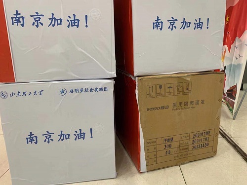 此次捐赠的物资包括威高医用材料有限公司平面医用隔离面罩300个,价值2000元;威高医用材料有限公司一次性防护服200套,价值1000元。总计3000元的抗疫物资,于8月2日上午抵达南京。四箱装满物资的箱子上张贴着“南京加油”字样,这些物资承载着捐赠人员对一线工作人员的关怀,将发放给奋战在疫情防控一线的工作人员,为他们送上一份温暖,表达对他们的祝福。团队成员向所有奋战在一线的工作人员,致以最崇高的敬意,并送去最深切的祝福,启明星实践团队将于一线工作人员一起共同抗疫,共克时艰。
