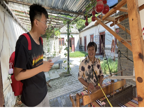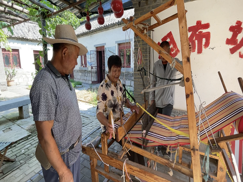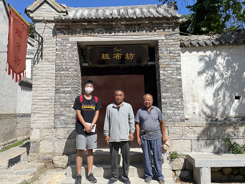 同朱家峪村民张翠萍女士交谈过程中,团队也遇到了来自山东省曲阜县的纺织传承者孙建国先生和孟祥云先生,孙建国先生表示,他们与张翠萍女士所用的织布机和织布手法方面有很大差异,而他们此行也旨在了解朱家峪土布纺织技艺,加强各地技艺文化交流与传承。除此之外,他也表示,不仅是土布纺织技术,保护非物质文化遗产也有相当重要的意义。传承的火种一旦熄灭,再将中断的技艺寻回则十分困难。他也提到,希望现在的年轻人能够利用现在的科技发展手段,为非物质文化遗产的传承注入新的活力而贡献一份自己的力量。