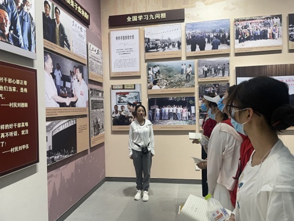 首先解说员带领团队成员参观了九间棚精神展览馆,直观感受九间棚的巨大变化。通过解说员的讲解,团队成员了解到九间棚村的由来及建设九间棚村一路走来的艰辛与不易,如今的九间棚村正在向乡村振兴新目标奋进。在展览馆里,团队成员还看到木棍、石锤、铁钉、铁棍,这些都是对这段艰苦历史的记载,团队成员对九间棚人愈发敬佩。