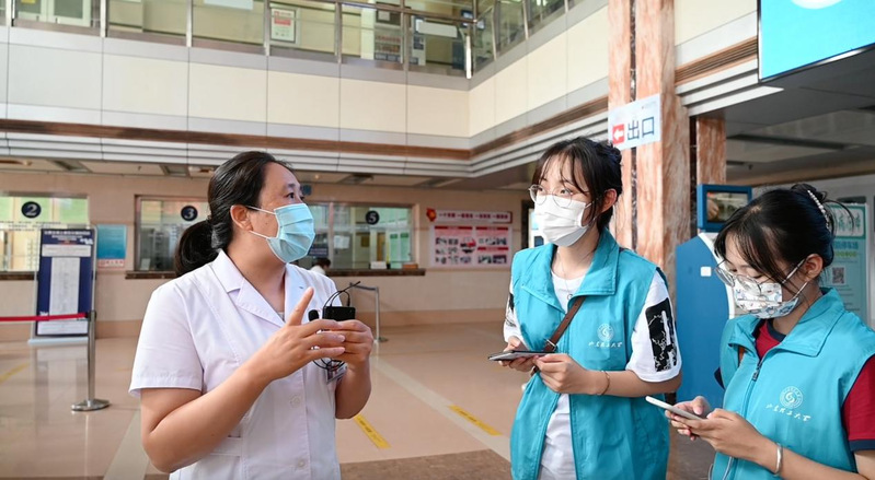 8月19日,启明星社会实践团队前往医院由毕主任带领实践团队成员学习《医院隔离技术规范》《医疗机构内新冠病毒感染预防与控制技术指南(第二版)》《新冠肺炎防控方案第八版》等防疫文件,了解了疫情防控知识以及医院防疫要求。接下来毕主任带我们回忆8.19日最新全国风险地区,并针对预检分诊须知中的重点要求进行回顾,使实践团队成员熟悉预检分诊通知重点及具体要求。在进行完理论讲解与学习后,实践团队展开志愿实践环节,在医护人员的带领下先在预检分诊处穿戴防护用品,进行清洁消毒,做好自身防护工作,再与预检分诊处的工作人员进行工作对接,开始开展志愿工作。