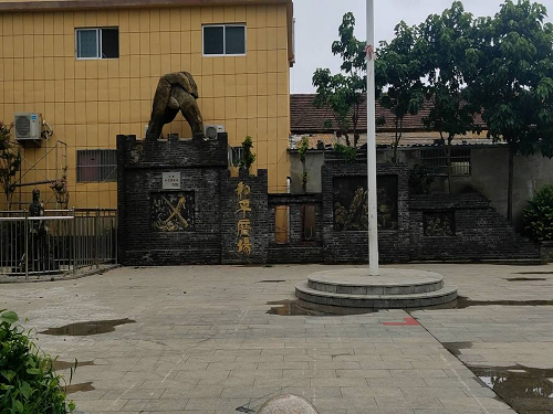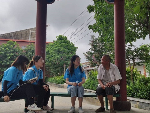 随后,团队去到当地村委,村长带领我们寻访到了前任村长,也是当地的抗日老兵。我们找到他时,他正在村民家门口下棋、纳凉,了解到我们探访的目的,他起身带领我们去往当地和平广场为我们讲解从前的抗日往事。通过老人的叙述,我们了解到他已经有87岁的高寿,身体仍然十分硬朗。他为我们讲解的过程中也吸引到了很多当地老人驻足听讲,并对他的故事做了适当补充。前任村长讲到从前渊子崖以毛河为界,西边为敌占区,是日伪军和汉奸的驻地;河东侧则为村民的居住区,后地下党员在此建立了临沂五区、解放区。他还讲到从前汉奸跟伪军们经常去村民家里收提款、要粮食,后来日军入侵,到处放火,见人就杀,驻村地下党员奋力抵抗,当时的庄长也带领村民拿铁锹与他们对抗。驻村地下党员与当地村民共同为抗日历史上添上了浓墨重彩的一笔。