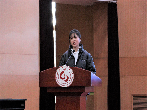 化教1802班班长徐炳英结合“厚德、博学、笃行、至善”的校训,分享了自己在大学的青春故事。她着重讲述了厚德需要我们赓续初心、著力担当;博学需要我们脚踏实地、厚积薄发;笃行需要我们研精覃思、求精求深,投身基层实践,坚定理想信念;至善则需要集体齐心协力,共创未来。