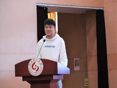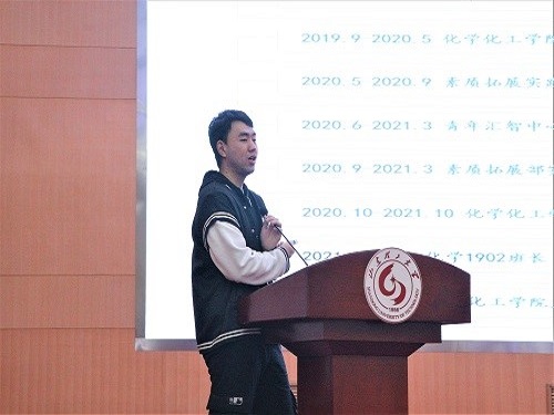 化工1804班邸贺祥以“适应老员工活”为主题,希望新生在学习上能够力争上游,做到不挂科、挣高分;交际上与人相处和睦、团结友爱;生活上做到卫生成绩达标,坚持体育运动,增强体魄,他提到这不仅可以更快速、更高质量地适应老员工活,同时对于提升自己的各项能力也有很大的帮助。