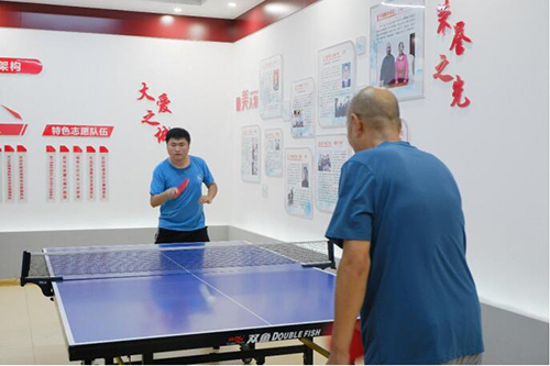 图为实践团成员与党员老爷爷一起打乒乓球 徐金鑫 摄