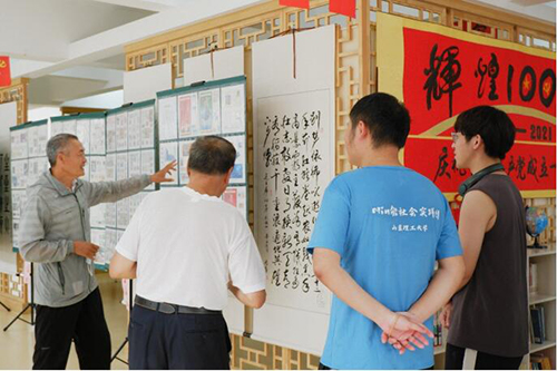 随后,阚爷爷带领实践团参观二楼的以“喜迎二十大·红心庆百年“的书画摄影集邮展览,阚爷爷讲到,不论是书法、绘画、摄影,还是集邮活动,都能传达出我们对于国家的热爱,对美好生活的向往。阚爷爷还提到,新华社区经常与书法协会、摄影协会等进行合作,举办一些活动,让社区越来越多的老人参与进来,通过各种活动,来丰富他们的生活,获得更多的乐趣。实践团成员也纷纷表示,之后也希望自己能够多涉猎一些有益的兴趣爱好,来充实自己。