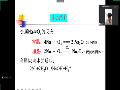 在授课过程中,队员宋扬首先通过一些金属反应的图片、视频直观的表现出反应现象,从而得到金属共同的化学性质,并书写了反应的化学方程式和离子方程式。在得到金属的通性后,宋扬选择了金属钠作为下一步的授课内容,张肖宁通过观看视频了解了金属钠的活泼性及其危险性。在进一步的深入了解后,张肖宁发现金属钠在与氧气反应时不同的条件会生成不同的产物。金属钠与水反应会有明显的反应现象,宋扬将其总结为“浮、融、游、响、红”。
