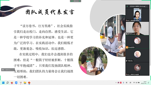 最后,团队成员代表总结发言,她指出:“读千册之书,百行而道”,社会实践引导我们走出校园、走向自然、感悟人生。它是校内学习的补充与延伸,也是一门较为广泛的研究课程。实践中我们锻炼了才能敢于、理念更新、学习吸收知识、拉近情怀的能力。在实践过程中,可能会遇到很多困境。但是“一筷轻折,十筷牢牢捆在身上”在弘扬团队精神、互助相助的同时,团队的力量将会让我们战胜一切困难。