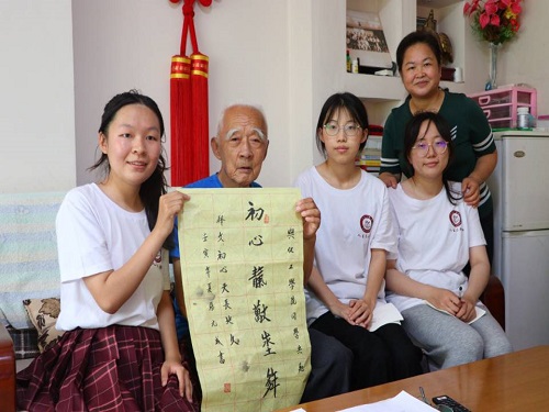 来到老党员张元成家里,处于耄耋之年的张元成虽然头发、眉毛雪白,但身板硬朗,精神矍铄。他热情地欢迎实践团成员的到来,张元成做了精心的准备,并给实践团成员准备了书法作品礼物,书法中展现出张元成对新一代学子的殷切希望。他向实践团成员展示自己写的书法作品,隽秀大气的毛笔字体现出一位为人师者的严谨与认真。张元成携长辈的殷切期望,深深激励着新一代学子鸿鹄之志。