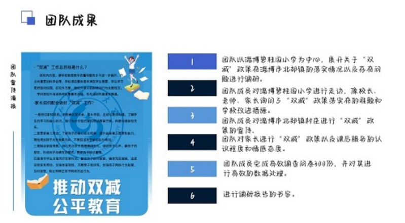 最后,由成员总结本次实践活动亮点内容:一是线上+线下的多重形式化,本次实践工作基于淄博市周村区北郊镇,线上进行问卷调查,线下寻访和调研,统筹兼顾保证调研结果的淮确性;二是抓位时政,点到乡镇,伴随着“双减”政策的出台,家长和员工成为减负的“主体参与者”,目前教育机构从事的研究多从优化作业设计、家校社协同育人等角度,忽视了“双减”政策对乡村教育名方面的挑战及解决办法,本实践团队以淄博市周村区北郊镇为基点,展开此次调研;三是持续跟踪调研,提出有效解决措施,“双减” 政策的出台是为了修复教育生态,助力基础教育回归人本真,助力基础教育实现高质量发展。但是“双减”政策在农村的落实面临着一些挑战,实践团队会持续跟踪淄博市周村区北郊镇,同时就“双减”政策带来的挑战提出相应的解决措施。