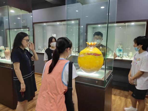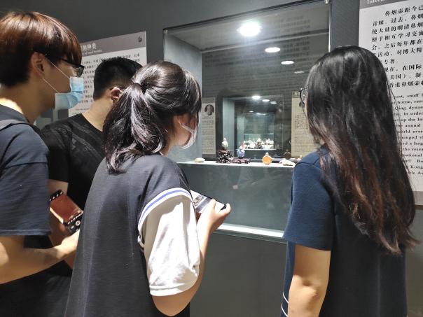 在苏老师的讲解下,团队成员了解到鲁派最有特色的是能够利用瓷器上用的釉彩在鼻烟盒的内壁上作画,然后烘烧形成内画鼻烟壶的瓷釉画,即使盛水画面也毫不受损。在参观过程中,团队成员感慨万分,惊叹于小小鼻烟壶里的乾坤世界,以及以琉璃瓶为载体带来的视觉冲击力。