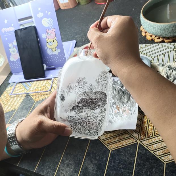 参观结束后,实践队员在苏老师的带领下有序来到了内画制作室,行走过程中只听到脚步声,不曾听到聊天声。一进门便见到正在作画的王老师,桌子上摆有一盏台灯,笔筒里是特制的画笔,眼前是调色盘,他正在用狼毫笔勾勒亭台楼阁的轮廓,俯身看去,鼻烟壶里面是磨砂面,模糊的内壁使笔尖变得不清楚,但是磨砂面却便于颜料的附着。在聊天过程中,团队成员了解到绘画主要用手腕的力量进行控笔,作画时会给颈椎带来较大负荷,十分考验人的心性,要心平气和地进行绘画,这正是为何办公室如此安静的原因。