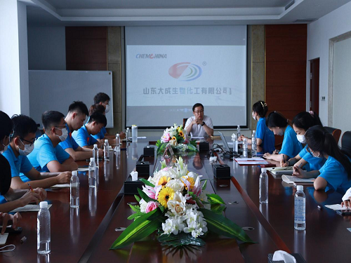 人事部主任张静对实践团队的到来表示热烈欢迎,并带领实践团队成员在接待室中观看山东大成生物化工有限公司介绍视频、了解其发展历程。