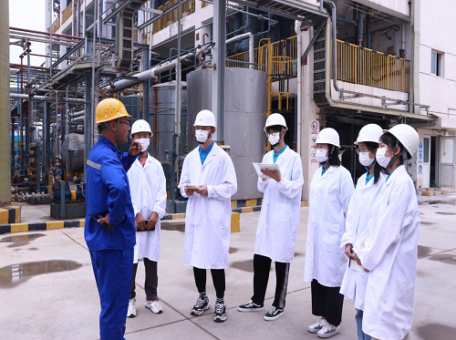 健康安全环保部徐伟主任分批带领实践团队成员进入厂区参观。徐伟依次介绍园区液氯库、液氨库、生产区域的安全结构设计、安全进出流程、危险预防设施、泄露处理措施、废液废气处理流程等。