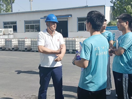 站在加工车间外,老师先对企业进行简单介绍。他表示,公司主要生产和销售:糠醇、丁苯吡胶乳、丙烯酰胺等产品,广泛应用于铸造、医药、农药、轮胎、陶瓷颜料、水处理等行业领域,获得世界各地客户和消费者的认可和赞誉。同时,公司还是“北京化工大学新产品研发依托单位”、“山东理工大学学术研究基地”。