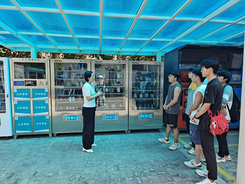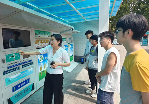 实践团首先来到临淄区玉禾田环境工程有限公司,受到工作人员的欢迎,队长向工作人员询问垃圾处理方式、智能回收机设置时间以及受欢迎程度等信息。随后,实践团根据工作人员提供的路线来到智能回收机投放点。队长向团队成员详细讲解了智能回收机的引入机制、操作流程、投放标准、独特优势等,并针对团队成员提出的问题进行了逐一耐心解答,加强了团队成员对于智能回收机的聊了和支持,深化了团队成员对此次社会实践团活动意义的理解。