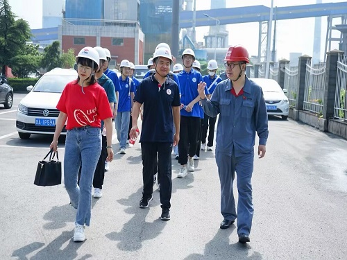 座谈结束后,王鑫等人带领实践团成员进入生产厂区进行参观,切实感受焦化厂的工艺过程。团队成员先后参观了焦炉、干熄焦车、锅炉重地、推焦车以及回收车间等,根据讲解了解焦硫烟气脱硫脱硝等过程,体验钢铁企业生产环节的高温岗位,同时也了解到管道运输时外漆色彩不同以区分不同液体等厂区知识。