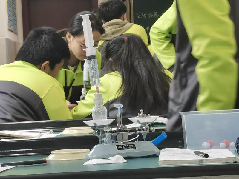 课本的知识终是有限的,只有亲身体会才能了解知识的魅力,这也是实践团选取实验教学的目的。在听到实践团成员将带领同学们动手做实验时,同学们都表现得十分高兴,经过相应的安全规范培训之后,实验教学活动正式开始。首先开展的是白磷燃烧实验,白磷的着火点很低,在40摄氏度下即可燃烧,为了观察这一现象,实践团成员手持注射器缓缓地向瓶中被热水浸泡的白磷注入空气。同学们屏气凝神,注视着瓶中的白磷,随着砰的一声,白磷迅速燃烧,同学们对此显得格外兴奋。
