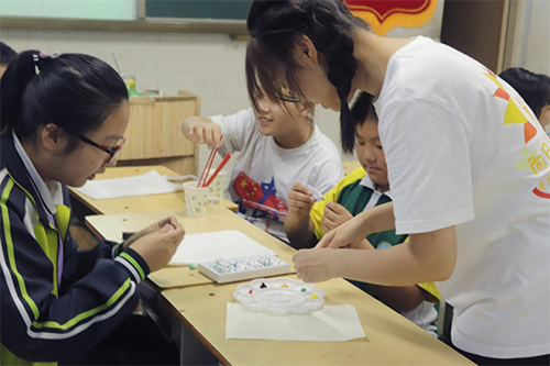 图为美术老师王雨涵与员工一起使用丙烯颜料