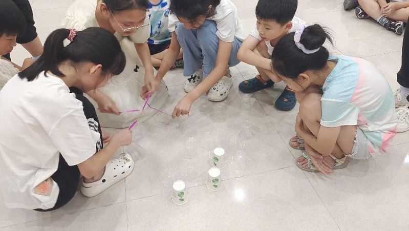 实践团成员带领孩子们开始的第一个游戏是夹杯子,由刘薇向大家介绍游戏规则:将小朋友们分组,每组准备相同数量的杯子、几根绳子和一个皮筋,再将绳子绑在皮筋上,每组小朋友们需要合作用绳子拉动皮筋套住杯子,然后把杯子移到指定位置,每组小朋友们的杯子移完即为游戏结束,用时最少的组合获胜。实践团成员带领孩子们玩这个游戏,是因为在完成游戏的过程中我们既能培养孩子们的团队合作意识,又能他们的提高动手和实践能力,最重要的是还能在这个过程中认识和结交新朋友。